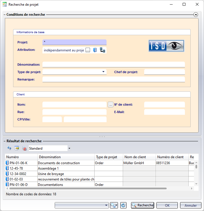 À l'aide de cette fonction, vous démarrez une Recherche de projet. Indiquez des critères de recherche et cliquez sur Recherche. Le caractère générique * peut être ici utilisé.