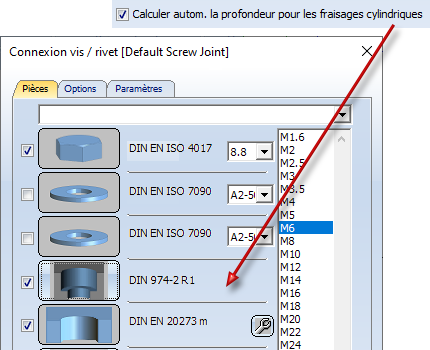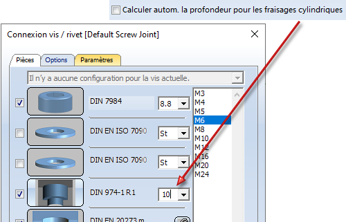 En activant la case Lister toutes les configurations, vous déterminez dans l'onglet Pièces la proposition dans la liste de toutes les configurations existantes, et non pas seulement pour la vis sélectionnée.