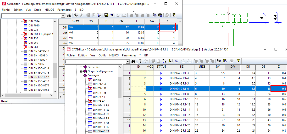 Si, par exemple, comme dans l'illustration ci-dessus, une vis avec un diamètre nominal 6 est utilisée, la hauteur de la tête de vis est alors de 4 et la valeur Z dans le tableau du fraisage DIN 974-2 R1 de 0,4. La profondeur du fraisage est donc de 4,4.