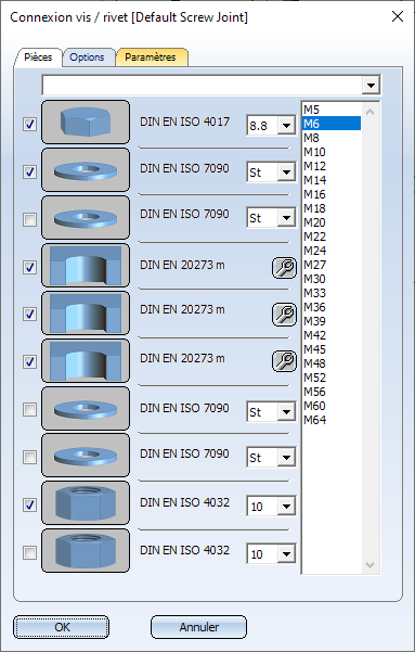 Pour sélectionner un élément pour le boulonnage/rivetage, cochez la case correspondante , puis choisissez les dimensions souhaitées dans la colonne de droite.