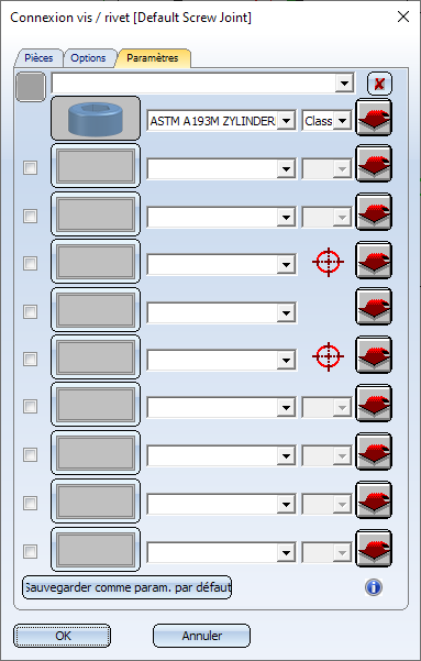 Les connexions vissées et rivetées souvent utilisées peuvent être configurées dans cet onglet, puis enregistrées dans un fichier dans configuration dans l'onglet Options.