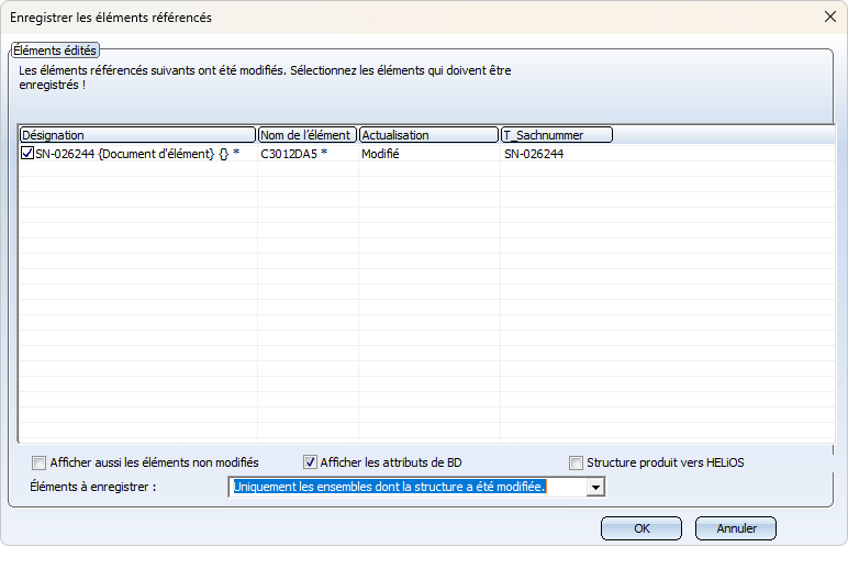 Si cette option est sélectionnée, en plus des ensembles dont la structure a été modifiée, les ensembles dont les éléments secondaires directement référencés ont un nouvel index de fiche de document sont également proposés à l'enregistrement. Cette option n'a d'effet que si les éléments et les ensembles sont gérés dans HELiOS.