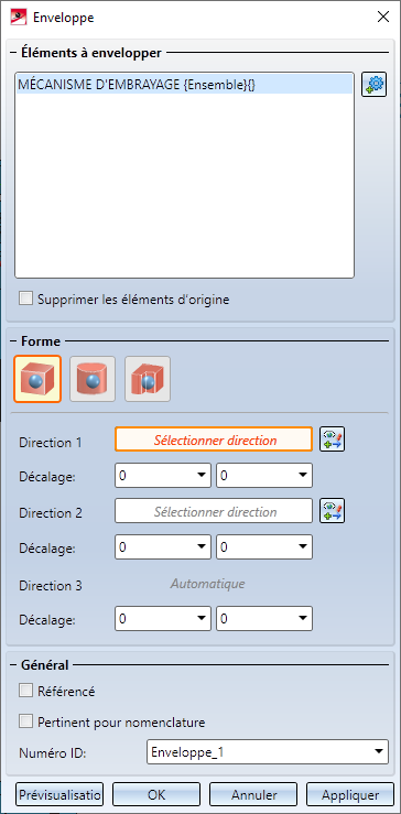 Dans le champ Numéro ID, HiCAD indique par défaut le nom Enveloppe_n, où n est un numéro consécutif. Si vous souhaitez attribuer un autre nom, réécrivez alors simplement l'entrée par défaut.