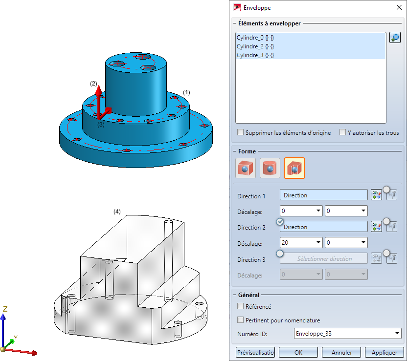 Pour cette Forme, la fenêtre de dialogue offre en plus la possibilité d'activer la case Y autoriser les trous. En cochant cette case, il est possible de prendre en compte les trous (les perçages par exemple) dans l'original et dans l'enveloppe.
