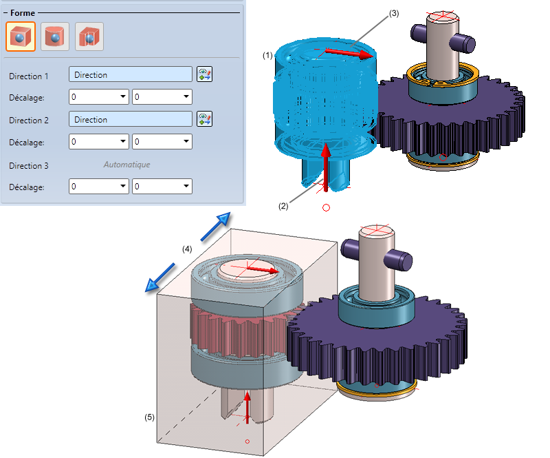 Pour chaque direction, vous pouvez indiquer un décalage et modifier ainsi la taille de l'enveloppe. La saisie d'une valeur positive entraîne une réduction du parallélépipède enveloppant.