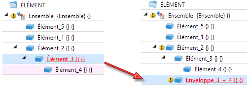 Si, par exemple, l'élément 3 et l'élément 4 sont sélectionnés, l'enveloppe se retrouve alors au même niveau de la structure que l'élément 3.