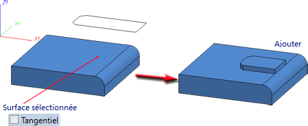 et identifiez les surfaces de l'élément concerné. Si la case Tangentiel est cochée, les surfaces qui sont connectées aux surfaces sélectionnées par des arêtes tangentielles seront alors prises en compte.
