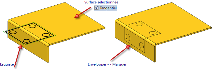 (1) Élément original avec esquisse, la surface sélectionnée est la surface enveloppante, (2) Envelopper l'esquisse, Mode : Découper