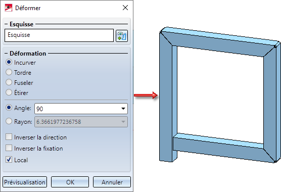 Pour incurver, la flexion s'effectue par défaut dans la direction de Z de l'esquisse. Au moyen de l'option de direction, il est possible d'intervertir le sens de flexion. Il en va de même pour tordre. La rotation s'effectue ici autour de l'axe X de l'esquisse. Au moyen de l'option de direction, il est possible d'intervertir le sens de rotation.