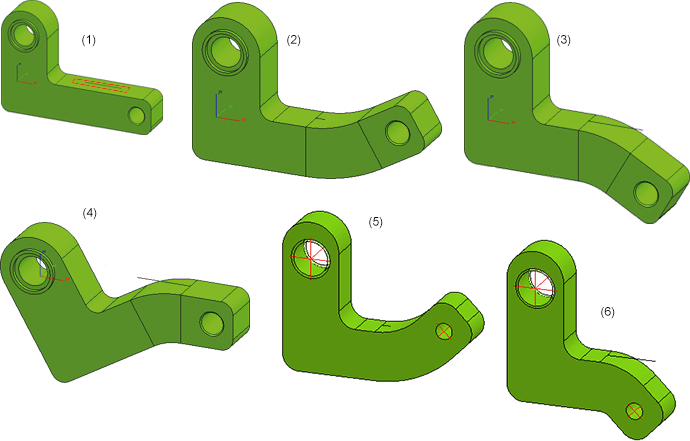 (1) Élément d'origine avec esquisse, (2) Incurvation avec angle de 30°, (3) Case Direction cochée, Fixation décochée, (4) Case Direction décochée, Fixation cochée, (5) Local, (6) Local, Case Direction cochée