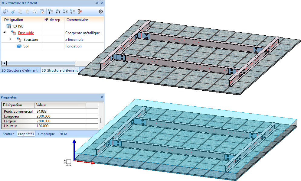 Observons l'exemple suivant d'un ensemble composé d'une structure de profilés et d'un sol.