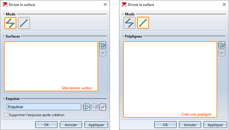 Une fois que vous avez sélectionné toutes les surfaces à diviser, vous devez déterminer l'esquisse de division. Les possibilités suivantes sont disponibles :