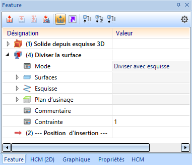 Un Feature nommé Diviser la surface est créé pour chaque division. Un double-clic sur l'entrée dans l'historique de Feature permet d'ouvrir la fenêtre de dialogue de la fonction Diviser la surface, par exemple pour corriger l'esquisse utilisée pour la division, modifier la sélection des surfaces ou choisir une autre polyligne.