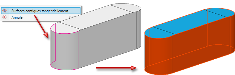 Cette fonction permet de sélectionner en une seule fois toutes les surfaces contiguës à la surface suivante sélectionnée. Les surfaces sont sélectionnées jusqu'à ce que la suivante soit ambiguë. Cela ne s'applique pas aux surfaces d'un solide. |