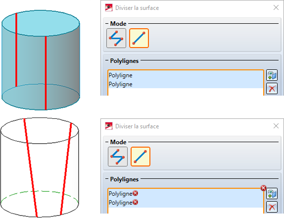 Dans ce mode, au lieu d'une esquisse, ce sont des lignes composées de droites segmentées qui sont utilisées pour la division. Ces lignes doivent se trouver exactement sur la surface à diviser. La surface est ainsi automatiquement prédéfinie et ne doit pas être explicitement choisie. Il est possible par la de sélectionner des surfaces planaires, des surfaces cylindriques et coniques.