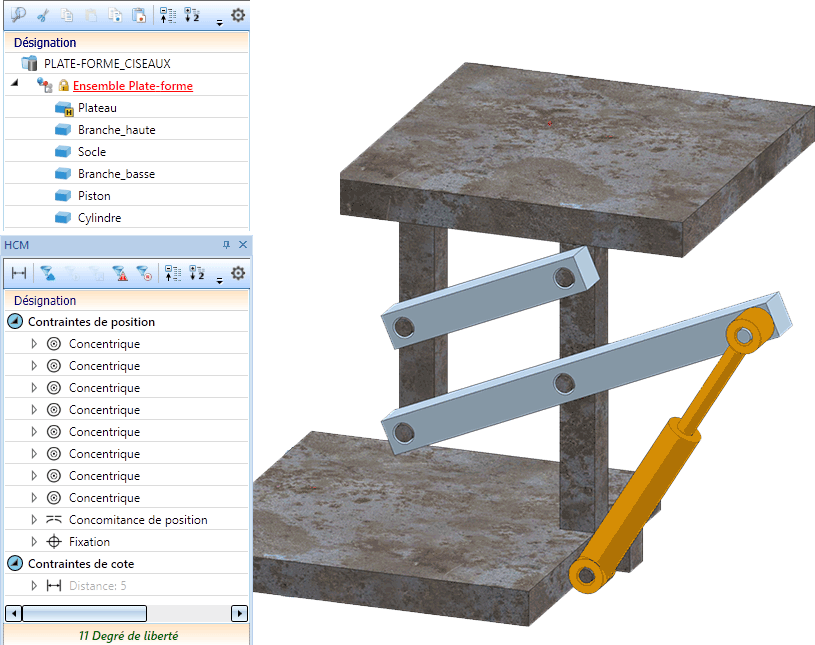 L'illustration montre une plate-forme en ciseaux. Les éléments de l'ensemble sont reliés entre eux par des contraintes HCM (cf. SCHERENHUBTISCH.SZA). Ici, le piston doit être mis en mouvement. Grâce aux contraintes HCM, les autres éléments de l'ensemble subiront un déplacement en conséquence. Le mouvement en question va de bas en haut.