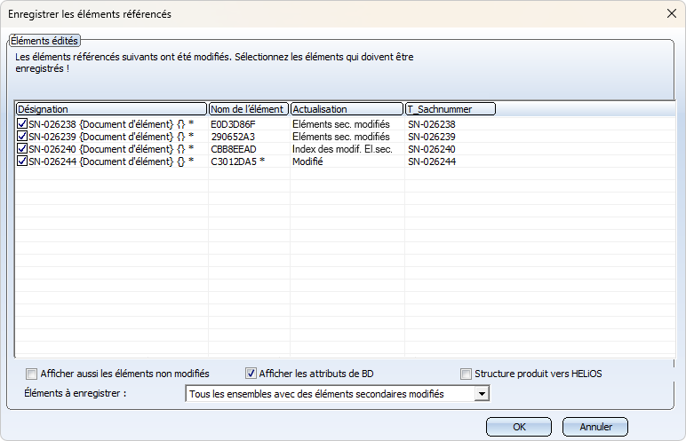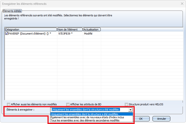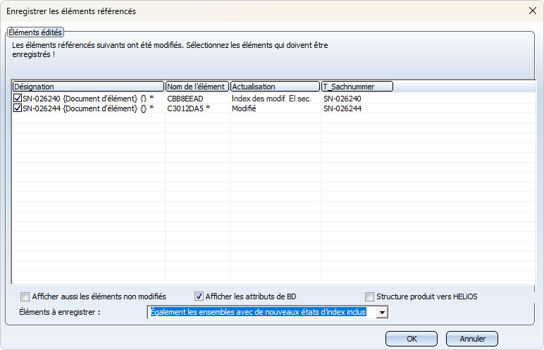 Si cette option est sélectionnée, en plus des ensembles dont la structure a été modifiée, les ensembles dont les éléments secondaires directement référencés ont un nouvel index de fiche de document sont également proposés à l'enregistrement. Cette option n'a d'effet que si les éléments et les ensembles sont gérés dans HELiOS.