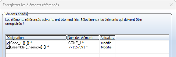Au moment d'enregistrer une scène, HiCAD contrôle ici si la scène contient des éléments référencés qui ont été modifiés au dernier enregistrement de la scène. Les noms des éléments trouvés ainsi que la raison de l'actualisation seront ensuite indiqués dans la fenêtre de dialogue Enregistrer les éléments référencés.