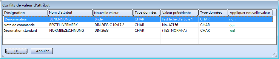 S'il y a un conflit entre les valeurs d'attributs qui sont données d'une part par le fichier VAA et d'autre part par la fiche d'article à transférer, la fenêtre suivante s'ouvre (exemple) :