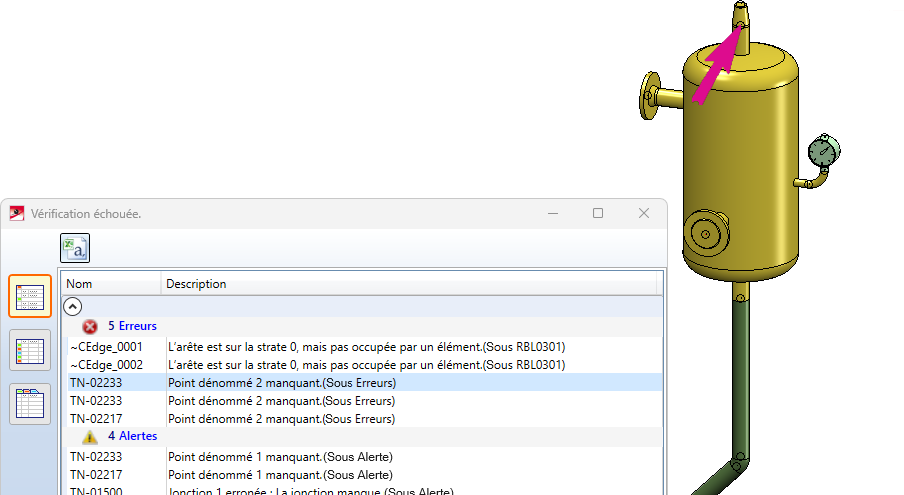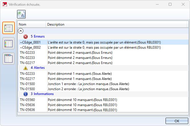Si des erreurs surviennent lors de la vérification, elles sont affichées dans une liste de résultats, par exemple :