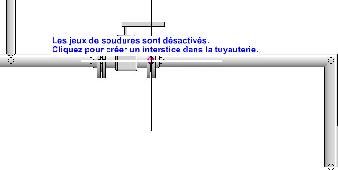 Notez qu'un tel interstice ne peut pas être refermé avec cette fonction, car il rompt le groupement de tuyauteries et, contrairement à un jeu de soudure, ne crée pas de relation entre les éléments de la tuyauterie. Pour fermer l'interstice, utilisez la fonction Combler l'interstice. Ou bien utilisez la fonction Modifier le tracé pour faire glisser le point final désormais libre vers un autre endroit.