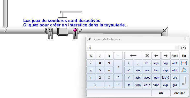 Si la prise en compte des jeux de soudure est désactivée dans les Paramètres de Tuyauteries+Process, vous pouvez toujours supprimer les jeux existants. Cependant, au lieu d'insérer un jeu, il vous sera proposé de créer un interstice dans la tuyauterie. Vous n'êtes alors plus limité aux raccords soudés. Vous pouvez définir la largeur de l'interstice en saisissant une valeur dans la calculatrice.