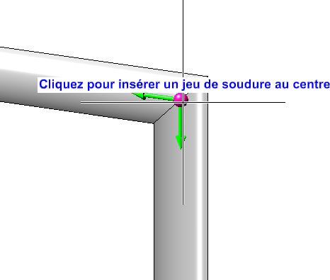 Après avoir cliqué sur l'icône de la fonction, HiCAD vous demande de sélectionner une jonction. Lorsque vous déplacez le curseur à proximité d'une jonction soudée, celle-ci est mise en évidence (1). Pour sélectionner la jonction à modifier, appuyez sur le bouton gauche de la souris. HiCAD vous demande ensuite de déterminer la manière dont un jeu doit être ajouté ou supprimé. Pour ce faire, des éléments graphiques sélectionnables sont affichés sur la scène (2).