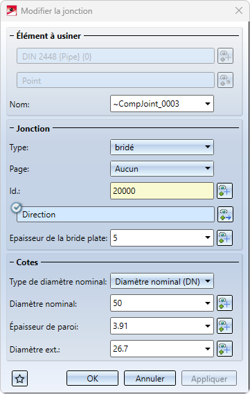 Cette valeur ne peut être indiquée que si le type de jonction choisi est bridé. En cliquant sur |