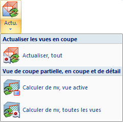 Les paramètres sélectionnés dans la fenêtre de dialogue s'appliquent aux vues en coupe, en coupe partielle et de détail créées par la suite. Si vous modifiez les paramètres, vous devez recalculer les vues déjà existantes afin d'y appliquer les modifications. Pour ce faire, vous disposez des fonctions correspondantes dans le menu Actualiser les vues. Toutefois, une modification du paramètre Réduire la distance des hachures si nécessaire n'est pas prise en compte.