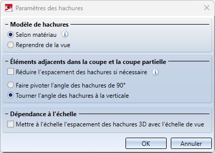 Pour les hachures 3D, vous pouvez définir si les hachures doivent être dépendantes ou indépendantes de l'échelle. Pour les hachures dépendantes de l'échelle, la distance des hachures est mise à l'échelle de celle de la vue. Pour cela, vous devez cocher la case correspondante.