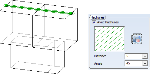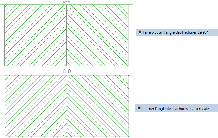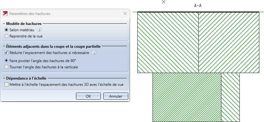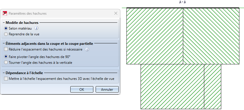 Les hachures de matériau existantes sont alors ignorées. Au lieu de cela, les paramètres de la vue correspondante sont repris pour le motif des hachures, ainsi que pour la distance et l'angle des lignes de hachures.