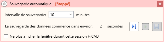 Peu avant le début de ce laps de temps, HiCAD fait apparaître dans la scène en cours la fenêtre de dialogue Sauvegarde automatique :
