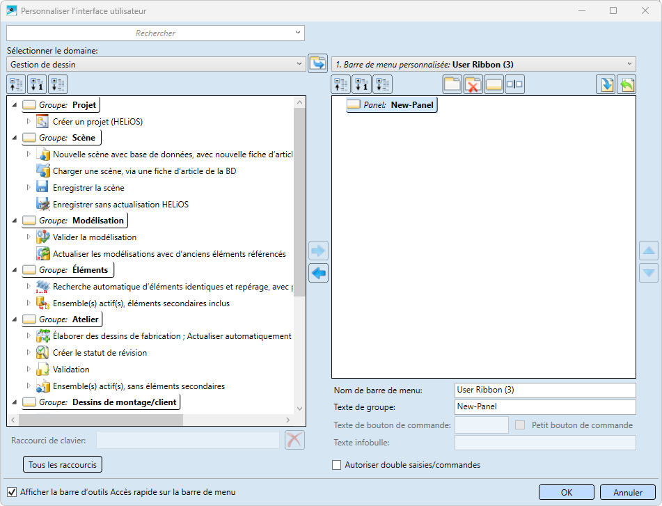 HiCAD offre la possibilité de dériver à partir des barres de menu (rubans) prédéfinies par ISD des barres de menu personnalisées. Vous pouvez ainsi regrouper les fonctions que vous utilisez le plus dans des barres de menu indépendantes. Au moyen des fonctions d'importation et d'exportation, vous pouvez également partager ces barres de menu avec d'autres utilisateurs.