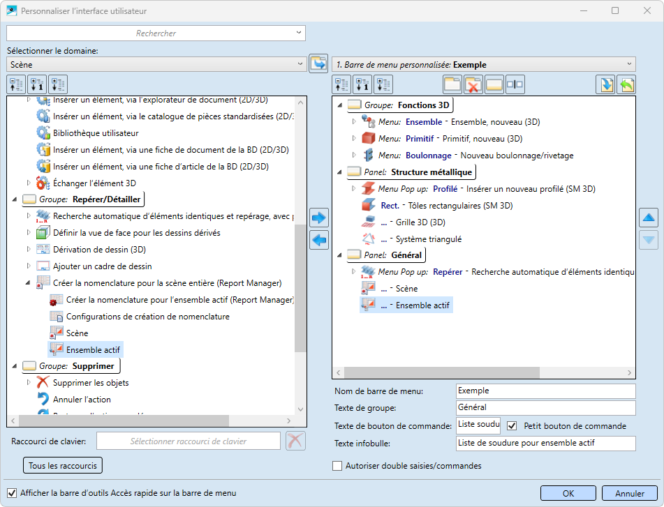 Dans les champs Texte de groupe, Texte de bouton de commande, Texte infobulle, les textes définis par ISD seront automatiquement récupérés au moment de transférer les fonctions dans la barre de menu, tout en vous laissant la possibilité d'en changer.