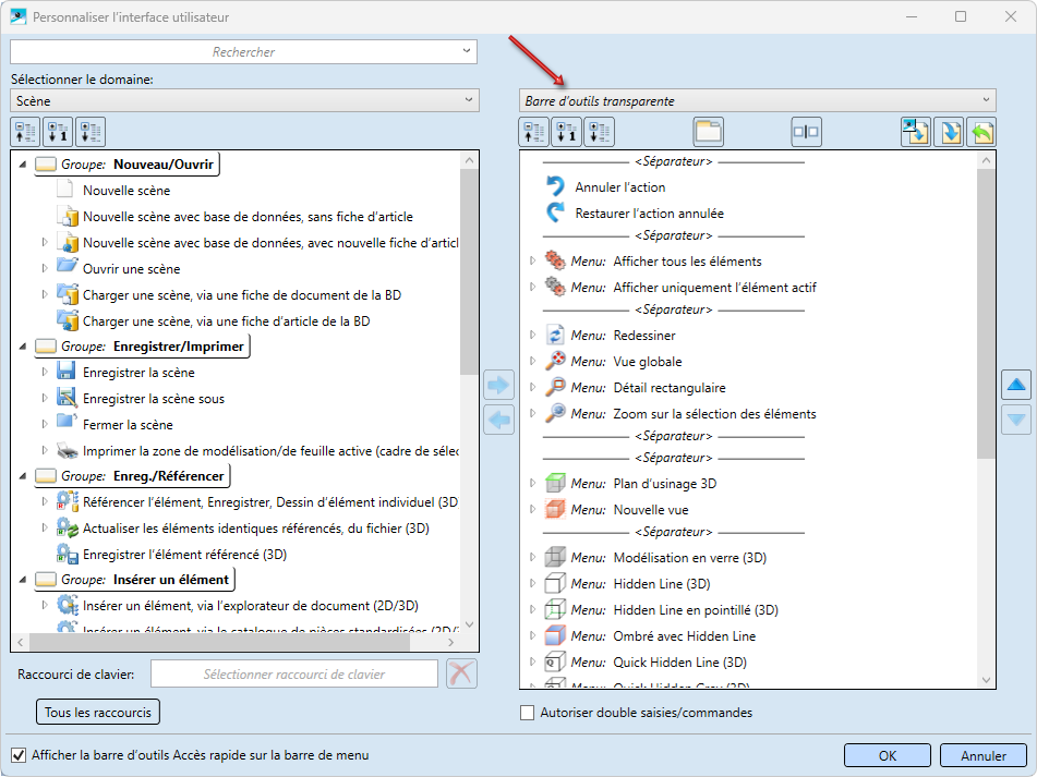 Si vous avez supprimé des fonctions de la barre d'outils transparente prédéfinies par ISD et que vous souhaitiez la compléter, sélectionnez alors sous Domaine à gauche l'entrée Barre d'outils transparente.