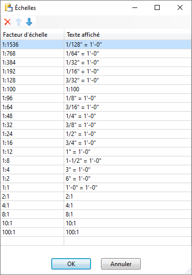 Observons par exemple la liste d'échelles Échelles standards, impériales, la saisie manuelle 2“ = 1‘ serait alors refusée comme erronée, car ce texte n'apparaît pas dans la liste.
