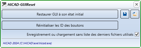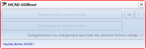 Restaurer GUI à son état initial Ce bouton permet de démarrer la réinitialisation de surface utilisateur de HiCAD. |