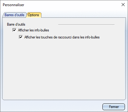 Vous pouvez, par ailleurs, avec l'onglet Options spécifier si le symbole doit être représenté plus grand et vous pouvez activer ou désactiver l'affichage des info-bulles, ainsi que les touches de raccourci éventuellement attribuées. Les info-bulles sont des textes d'information qui s'affiche par pop-up lorsque vous passez le curseur de la souris au-dessus du symbole. Cochez l'onglet dont vous souhaitez transférer les fonctions dans votre barre d'outils personnalisée.