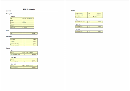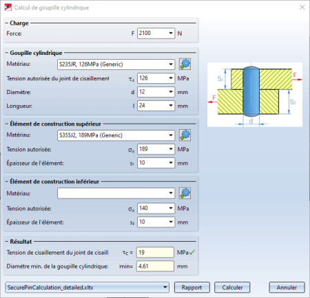 Cette fonction vérifie si une goupille cylindrique qui a été insérée pour la connexion de deux éléments possède la stabilité requise pour résister à une force spécifique. La fonction calcule la tension de cisaillement du joint de cisaillement et le diamètre minimum de la goupille.