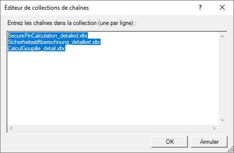 Vous avez bien sûr la possibilité d'utiliser vos propres modèles. Vous pouvez au mieux les créer en copiant et en modifiant un des modèles ISD. Les modèles doivent être enregistrés dans le répertoire HiCAD templates\SecurePinCalculation. Pour que vos propres modèles apparaissent également dans la fenêtre de dialogue du Calcul de goupille cylindrique, vous devez compléter la liste dans le Gestionnaire de Configuration sous ... > Paramètres système > Calculs > Calcul de goupille cylindrique.