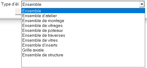 Sélectionnez, si besoin, le type de l'ensemble de la liste de choix Type d'élément. Vous avez le choix entre les ensemble en général, les ensembles vissés (de montage) et soudés (d'atelier), ainsi que d'autres ensembles spécifiques à la rubrique Structure métallique/Enveloppes de bâtiment.