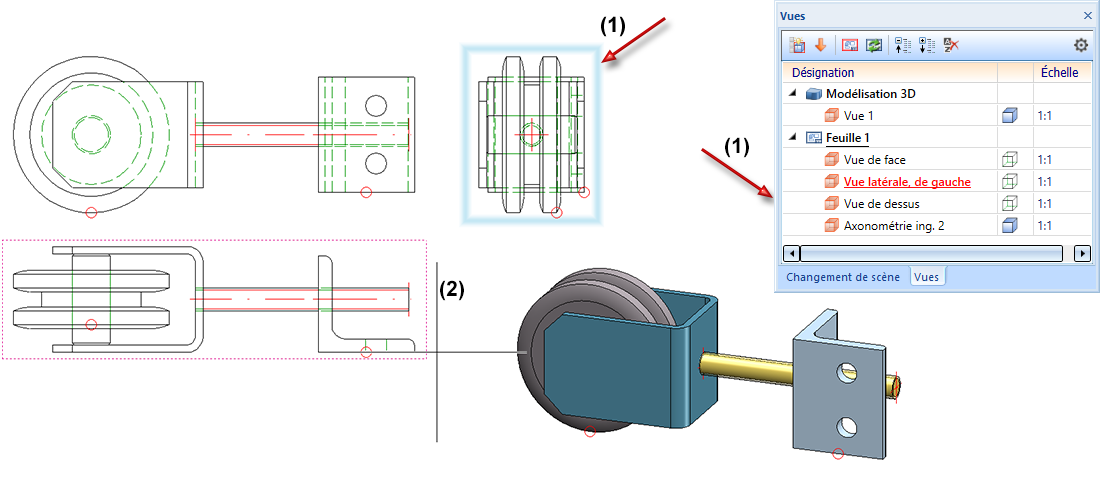 Différentes vues d'une modélisation 3D. Le cadre bleu (1) identifie la vue active, le cadre en pointillé (2) la vue au-dessus de laquelle le curseur se trouve.