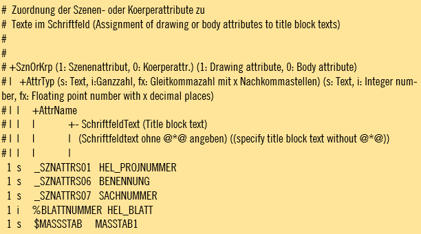 - Si vous recourez à la fonction Remplir le cartouche (des attributs), ce sont les attributs de texte du fichier SchrFe_ausAttr.dat du répertoire SYS de HiCAD qui seront lus. En modifiant en conséquence ce fichier, vous avez la possibilité de paramétrer le texte du cartouche.
