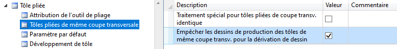 Les tôles de même coupe transversale peuvent ne pas être prises en compte pour le dessin d'exécution. Pour ce faire, il faut dans le Gestionnaire de Configuration, sous Tôle pliée > Tôles pliées de même coupe transversale, cocher la case Empêcher les dessins de fabrication des tôles de même coupe transversale pour la dérivation de dessin. Par défaut, la case est décochée.