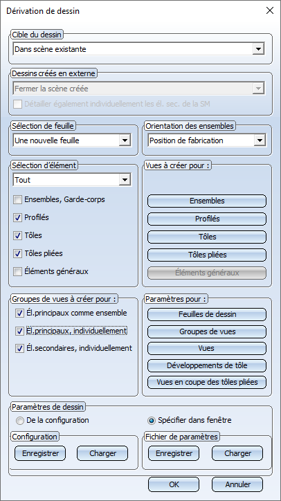 Le paramétrage pour la dérivation de dessin s'effectue via la fenêtre de dialogue Dérivation de dessin.