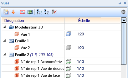 Les dérivations de dessin seront créées comme vues de feuille de la scène en cours ou d'une nouvelle scène et sont visibles à tout moment via l'onglet Vues de l'ICN. Les paramètres de feuille suivants sont possibles :