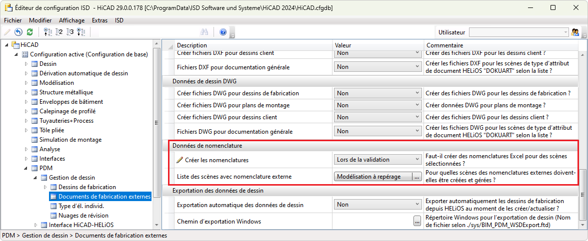 Les nomenclatures Excel de certaines scènes (pour l'instant uniquement pour les modélisations de repérage) peuvent également être créées automatiquement et gérées dans HELiOS avec les dessins de fabrication. Pour cela, les paramètres doivent être définis en conséquence dans le Gestionnaire de Configuration sous PDM > Gestion de dessin > Documents de fabrication externes.