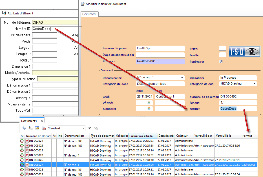 De plus, l'attribut HICADPROJNUMMER est affecté au projet du document HiCAD.