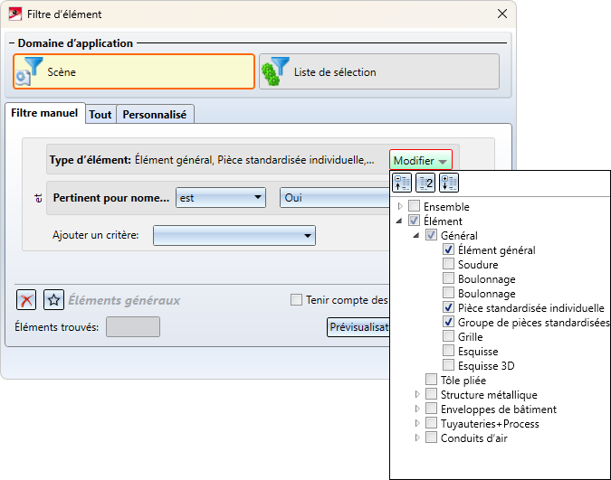 Avec ce paramètre, seuls seront pris en compte les éléments 3D généraux qui remplissent les conditions du filtre d'éléments définis dans le fichier favori Structure métallique > Gestion de dessin > Éléments généraux (BIM-3DPartFilter.xml). Les filtres d'éléments prédéfinis par ISD peuvent être personnalisés à l'aide de la fonction Rechercher