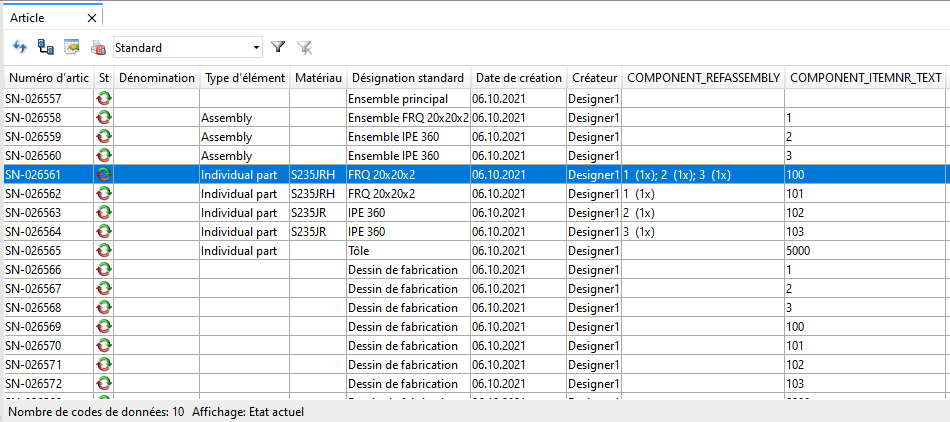 Dans l'exemple ci-dessus, seul l'ensemble a été cependant détaillé. Cela signifie que seul l'ensemble obtient le lien Dessin à jour (Drawing up to date). Le profilé et la tôle obtiennent le lien Sans dessin (Without drawing).